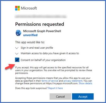 In the next step the process will check if the Admin Consent has already been granted to Microsoft.Graph. If not granted, then you will be presented with a prompt as shown below: