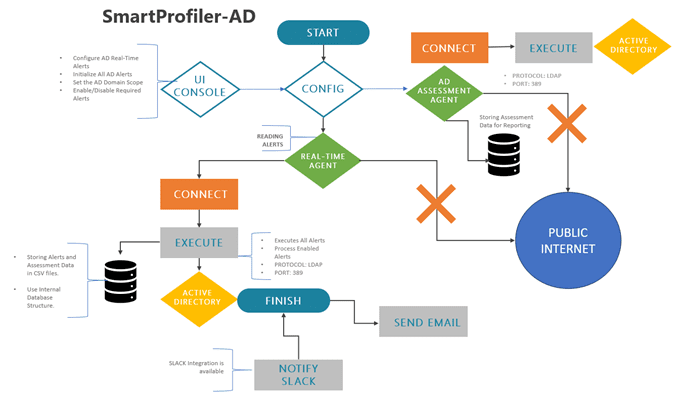 The SmartProfiler AD Real-Time Agent (installed as Windows Service) communicates to Domain Controller over default port and Protocol (LDAP:389). Even the Active Directory Assessment communicates over the same protocol. Real-Time and AD Assessment Agents do not connect to Public Internet for any communication. SmartProfiler uses Internal Database to store required data for real-time monitoring and assessment. The data type is volatile and keep changing based on the alert data fetched from Active Directory. No data is stored on Public Internet.